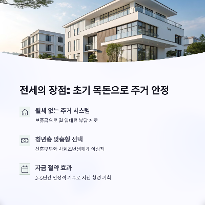 전세는 초기 비용이 크지만, 매달 지출이 없어 장기 거주에 유리합니다. 하지만 자산이 쌓이면 월세+투자가 더 유리할 수 있어요.