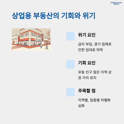 이러한 상황에서 상업용 부동산 투자자는 공실률이 낮고 유동 인구가 많은 지역을 선별해 투자해야 합니다. 장기적으로는 금리 인하 이후 회복될 가능성이 있으므로, 신중한 접근이 필요합니다.